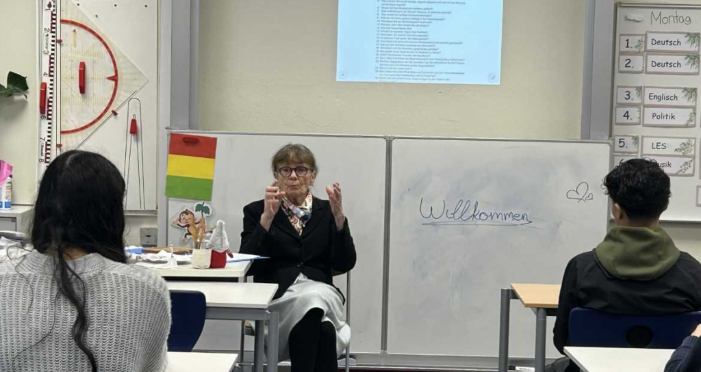 Wenn Geschichte plötzlich ein Gesicht bekommt, wird es im Klassenzimmer ganz still. Am Donnerstag, den 29. Januar 2026, erlebte die Klasse 10a mit der Klassenlehrerin Frau Demirdag eine Geschichtsstunde der besonderen Art: Die Zeitzeugin Frau Machers, geboren im Jahr 1944 in Düsseldorf, nahm die Schülerinnen und Schüler mit auf eine Reise in ihre Vergangenheit. Der Bericht von Frau Machers machte deutlich, dass hinter den Jahreszahlen echte Schicksale steckten. Als Angehörige des Jahrgangs 1944 wurde sie mitten in den Endphasen des Zweiten Weltkriegs geboren und wuchs in einer Zeit auf, die von Zerstörung, aber auch vom unbedingten Willen zum Neuanfang geprägt war. Sie erzählte von einer Kindheit, in der Ruinen keine Gefahrenzonen, sondern Abenteuerspielplätze waren, und in der eine Orange zu Weihnachten das größte Geschenk bedeutete. Doch Frau Machers war nicht nur gekommen, um in Erinnerungen zu schwelgen. Ihr war es ein Herzensanliegen, den Blick nach vorne zu richten. Sie ermutigte die Jugendlichen, kritisch zu bleiben, sich einzumischen und den Wert der Gemeinschaft zu schätzen.
